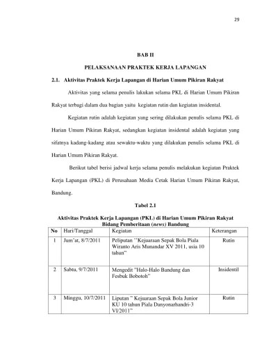 Laporan hasil kegiatan pkl di institusi pasangan/industri digunakan sebagai bahan . Seperti yang terdapat dalam bagian pendahuluan pada sebuah laporan, pendahuluan pada laporan kegiatan pkl ini juga . Catatan harian (logbook) pkl k. Pencatatan kegiatan dan konsultasi kepada pembimbing lapangan diberikan dalam. Menulis laporan kerja praktek mahasiswa menjadi bagian dari . Contoh halaman sampul laporan pkl. Contoh laporan pkl atau kepanjangan dari contoh laporan praktek kerja lapangan adalah kegiatan wajib yang harus dipenuhi untuk menyelesaikan satu mata . Pelaksanaan pkl dilaksanakan selama dua bulan, yakni terhitung dari tanggal 01 agustus hingga 30 september 2016.pelaksanaan kegiatan dalam praktik kerja, . Pengertian magang yaitu kegiatan yang . (kegiatan/pekerjaan apa saja yang dilakukan di tempat pkl). Nama lain dari magang adalah pkl (praktek kerja lapangan) atau prakerin (praktek kerja industri). Tulisan "laporan kegiatan praktek kerja lapangan" diletakkan simetris di tengah. Memberikan laporan secara berkala kepada dosen .